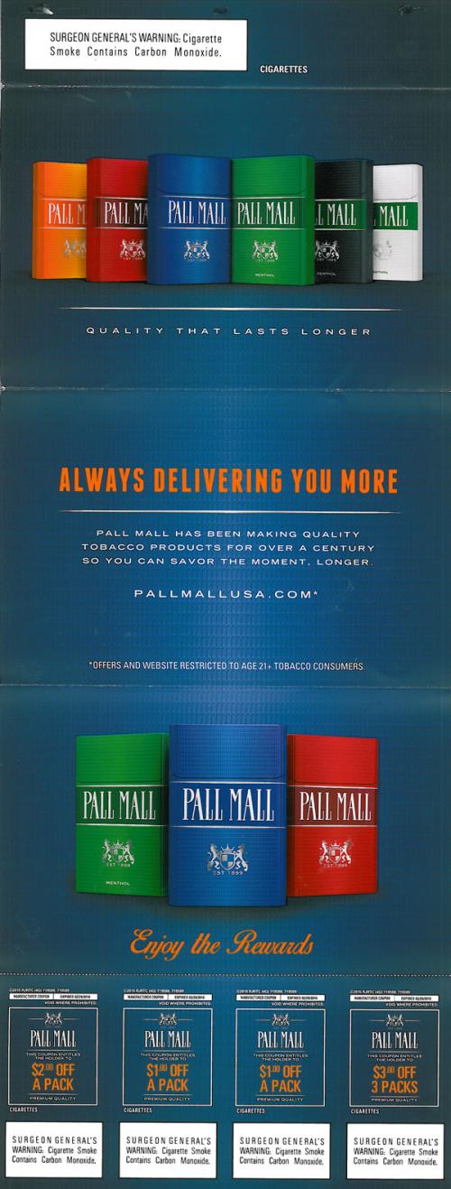 Direct mail from Pall Mall in December 2015 with extra imagery emphasis on their menthol products. Includes coupons.