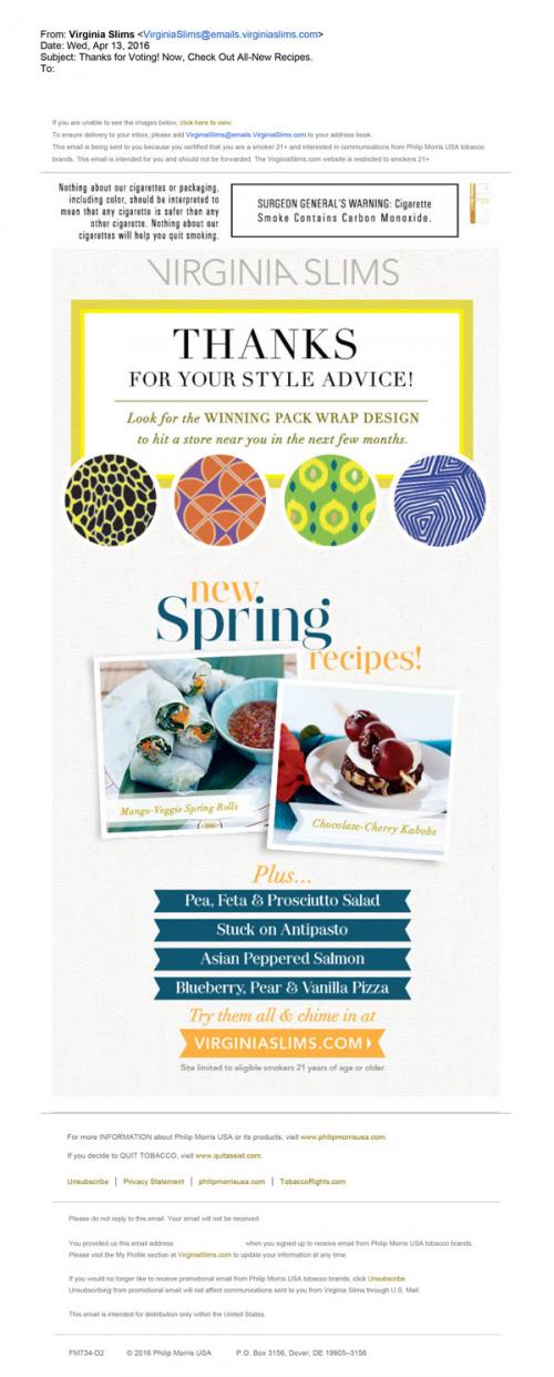 Email received from Virginia Slims April 13, 2016 thanking the recipient for voting for a new pack wrap design. The email also invites the recipient to the brand websites to view new Spring recipes.