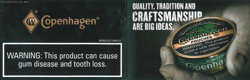 Direct mail from Copenhagen in January 2016 to promote their pouch products. Emphasis is on the wintergreen flavor in the images. Includes two coupons and invites the recipient to the brand website. Text: "Quality, tradition and craftsmanship are big ideas. We packed them into a pouch."