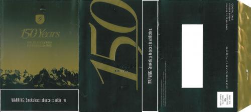 Direct mail from General Snus in March 2016 celebrating 150 years of their product development and quality. Includes coupons and addresses of local retail distributors. The mailing design has gold foil accents. Text: "We measure elevation in decades. 150 years of elevating experiences."