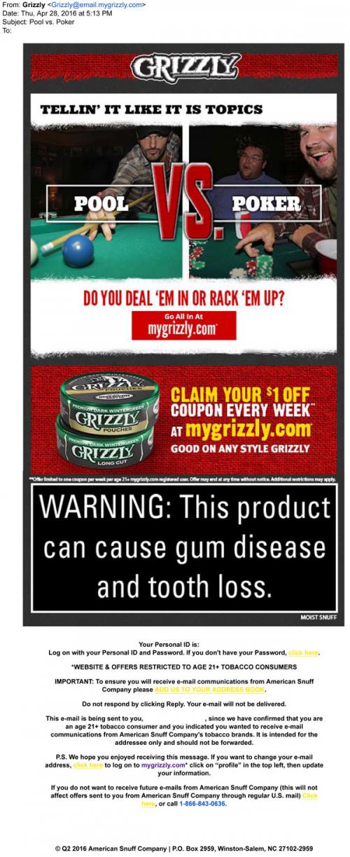 Grizzly email from April 2016 with the recent "Tellin' it like it is" discussion topic about pool vs. poker for the recipient to participate in. Also links to the brand website to claim the weekly coupons.