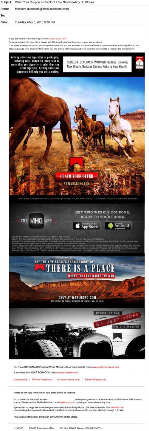 Marlboro email from May 2016 with a link to claim monthly coupons on the brand website. Also promotes the MHQ app to get weekly coupons delivered to a mobile phone, as well as links to the Cowboy Up video series and a feature on cars by Marlboro Black.