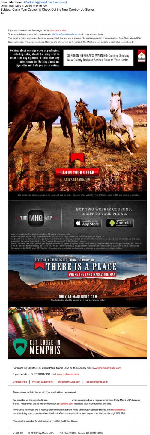 Marlboro email from May 2016 with a link to claim monthly coupons on the