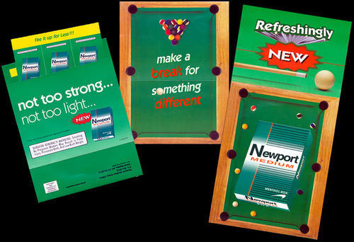 Direct mail from Newport in promotion of the Newport Medium blend. Image of a pool table on the cover. Text: "Make a break for something different - Refreshingly new Newport Medium Menthol - not too strong... not too light." Mailing included 3 coupons: 1 free pack coupon, 1 Buy 1 pack get 1 free coupon, and one $1.00 off a pack coupon. Piece also came with a survey to fill out about smoking preferences to mail in and receive another free pack coupon.