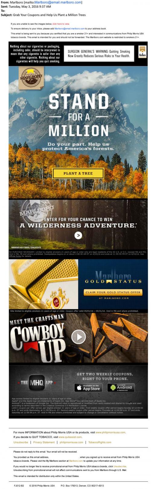 Marlboro Gold email from May 2016 promoting the "Stand for a Million" project by Team Marlboro, which invites people to plant a tree for a chance to win a wilderness adventure. Also promotes the MHQ app to get weekly coupons