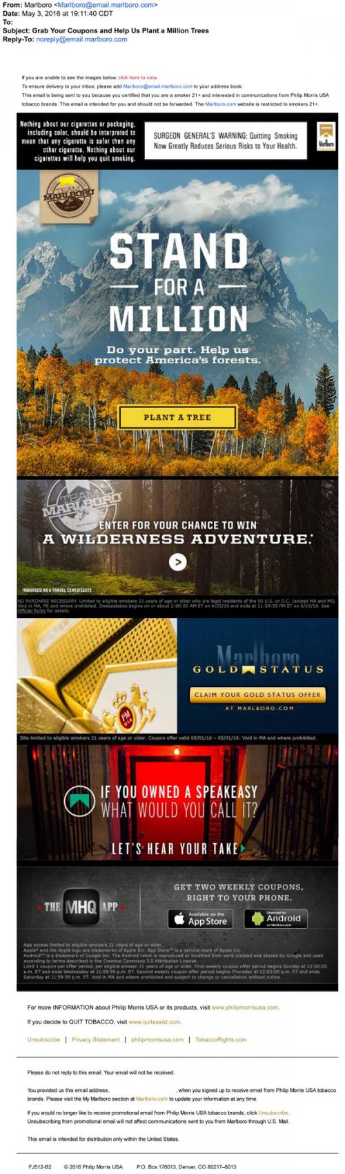Marlboro Gold email from May 2016 promoting the "Stand for a Million"