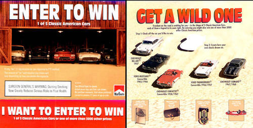 Marlboro Classic American sweepstakes at duty free shop, Newark Airport, Summer 2001. Sweepstakes for international travelers. Prizes include: American Classic cars, jukeboxes, travel bags and Zippo lighters.