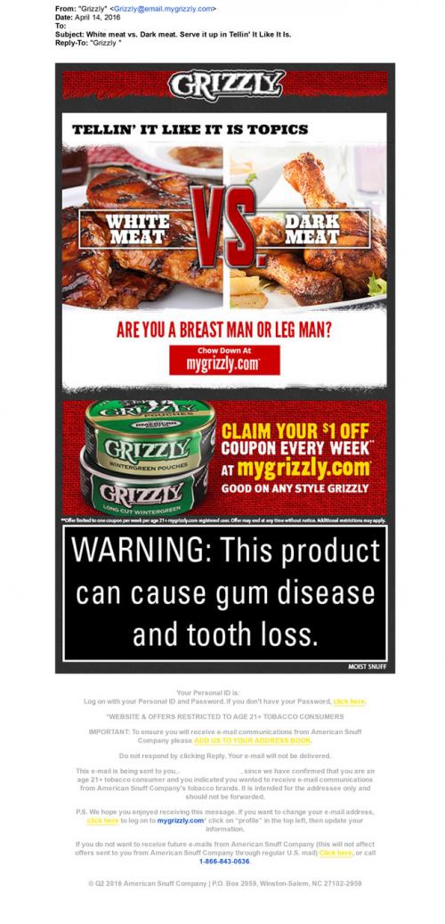 Email from Grizzly received April 2015 reminding the recipient to claim their weekly coupon, as well as an invitation to the brand website to participate in the current "Tellin' it like it is" topic (White meat vs. dark meat). "Are you a breast or leg man?"