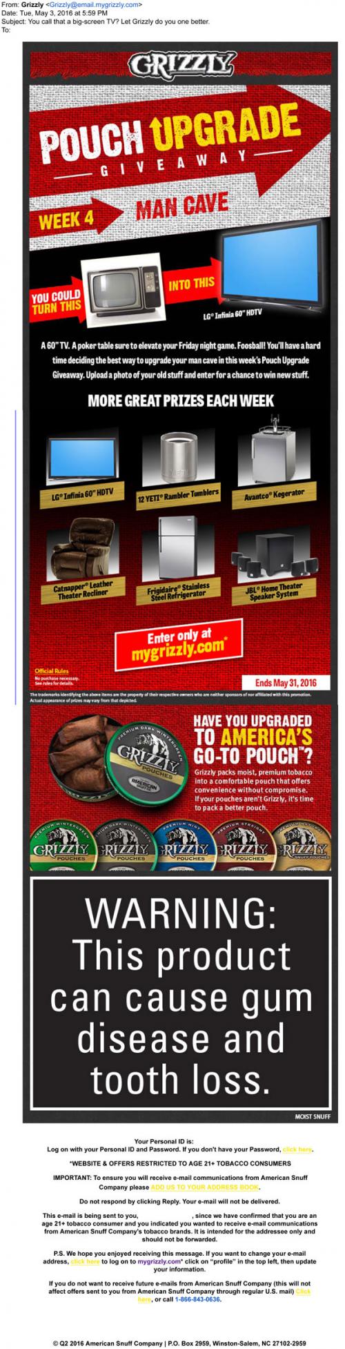 Grizzly email from May 2016 promoting the Pouch Upgrade Giveaway with this week's prizes intended to upgrade your "man cave". Visitors to the brand website are invited to upload photos of their old stuff to get a chance to win newer replacements.