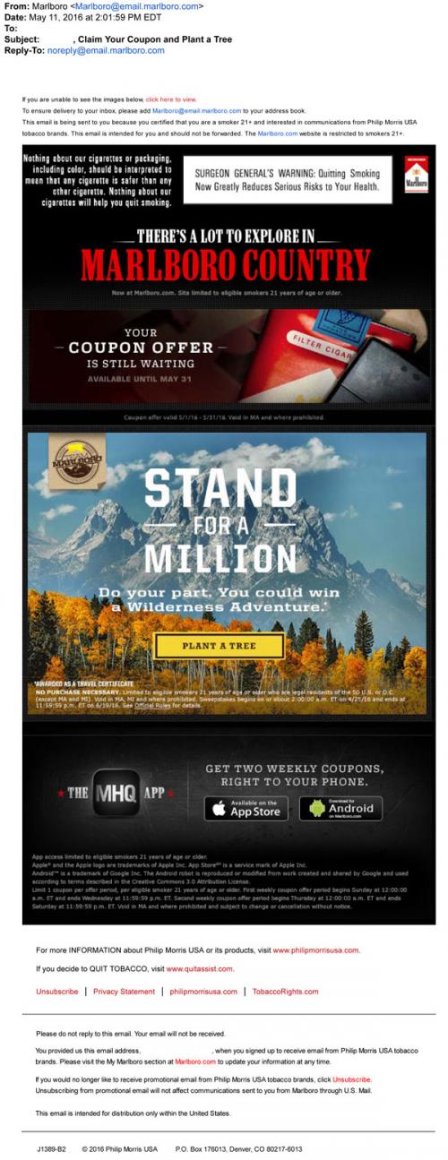 Marlboro email from May 2016 promoting the Stand For A Million project, where participants can plant a tree for a chance to win a wilderness adventure. Also reminds the recipient to claim their monthly coupon and use the MHQ app for extra weekly coupons sent to a mobile phone.