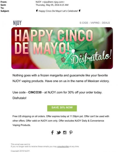 NJOY email with a discount code to celebrate Cinco de Mayo in May 2016.