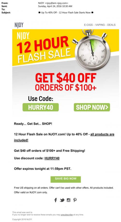 Email from NJOY in April 2016 announcing a 12 hour flash sale happening on the brand website, where customers can save 40$ off their orders of 100$ or more.