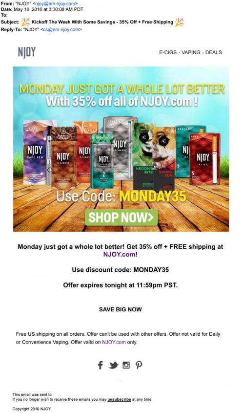 NJOY email with a sale to kickoff Monday in May 2016. Includes a discount code for use on purchases made through the brand website.