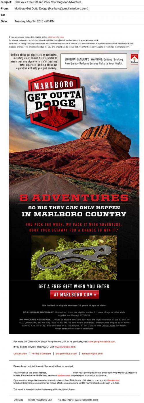 Marlboro email from May 2016 promoting the Get Outta Dodge video tour of Marlboro Country. Participants choose weekly where to explore for a chance to win. For a limited time, free gifts were offered to visitors at the brand website to choose from (can opener, headlamp, portable speaker).