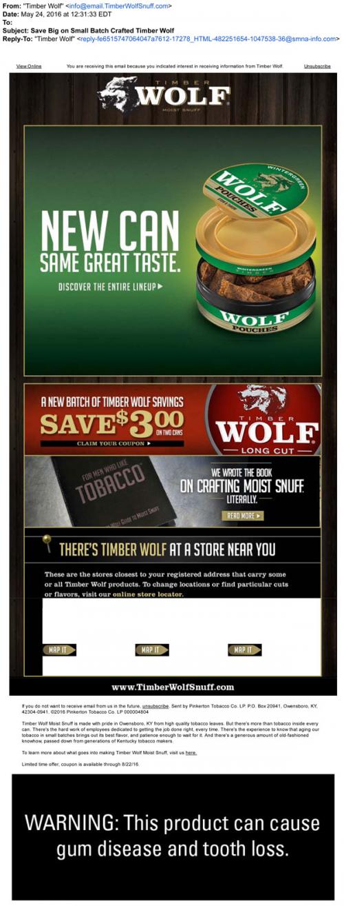Timber Wolf email from May 2016 linking to the brand website to claim coupons and check out their new can. Also links to a store locator and the story of the brand's craftsmanship.