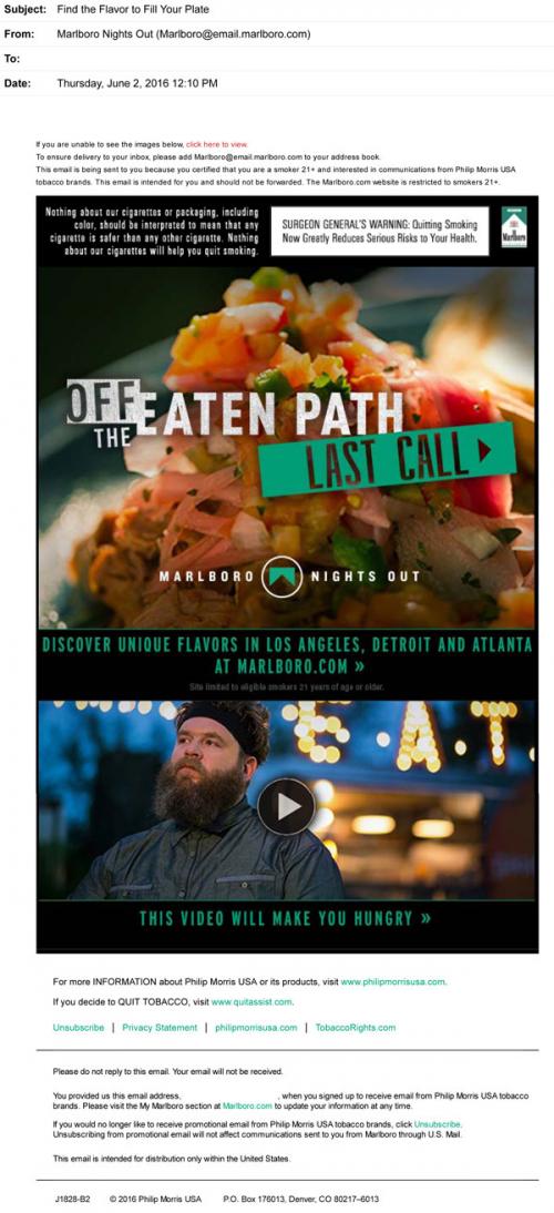 Email from Marlboro Menthol in June 2016 linking to featured articles and videos on the brand website about unique eating experiences across the county.