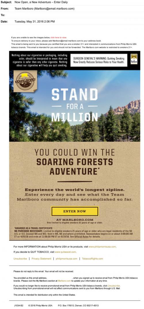 Email from Marlboro in May 2016 promoting the Stand for a Million project and inviting the recipient to enter on the brand website for the chance to win a wilderness adventure.