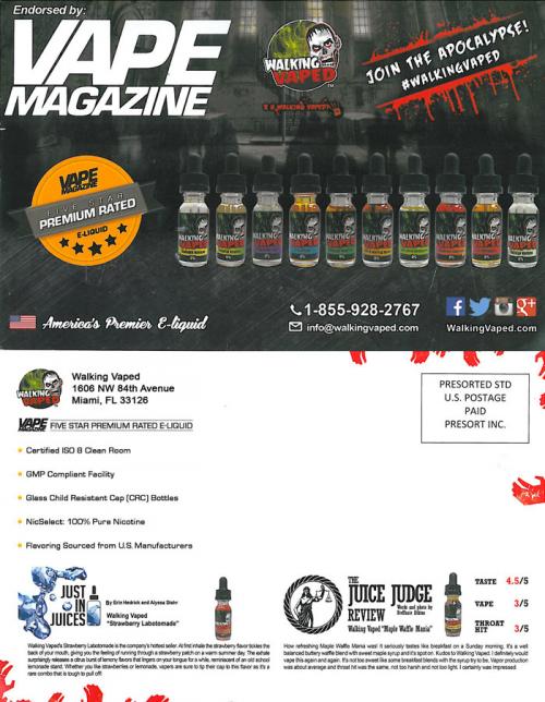 Direct mail postcard sent by Walking Vaped, an e-liquid company promoting itself with a zombie theme similar to the popular TV show, Walking Dead. Includes a list of traits that make their products "premium rated," as endorsed by Vape Magazine, and some customer reviews. Promotes their flavor lineup and various social media opportunities.