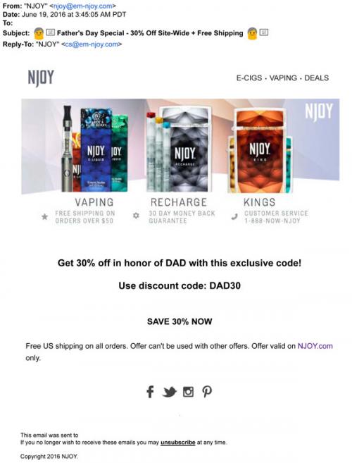 NJOY email promotion for Father's Day from June 2016. They offer a discount code "in honor of DAD" for use on the brand website.