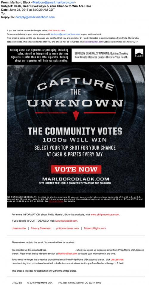 Email from Marlboro Black in June 2016 promoting the Capture the Unknown contest on the brand website. Visitors are invited to upload photos and vote on the entrants for a chance to win.