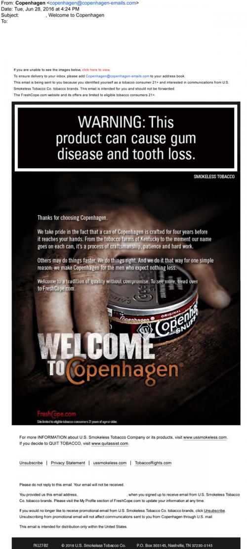 Welcome email from Copenhagen sent to a new customer in June 2016. Thanks the recipient for joining and invites them to the brand website.