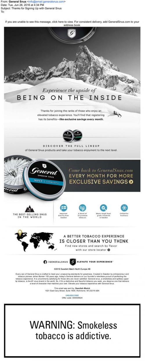 Welcome email from General Snus received in June 2016 thanking the new customer for signing up. Invites the recipient back to the brand website for monthly coupons.