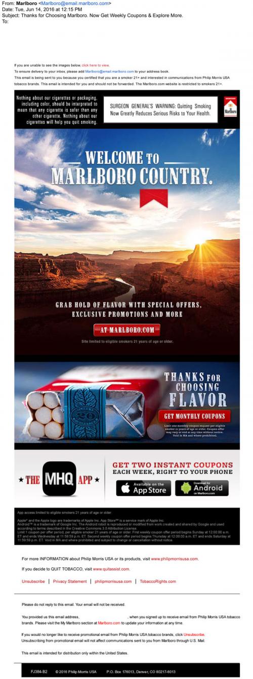 Marlboro email from June 2016 welcoming a new customer who registered on the brand website. Provides links to claim monthly coupons and download the MHQ app to get weekly coupons sent straight to a mobile phone.