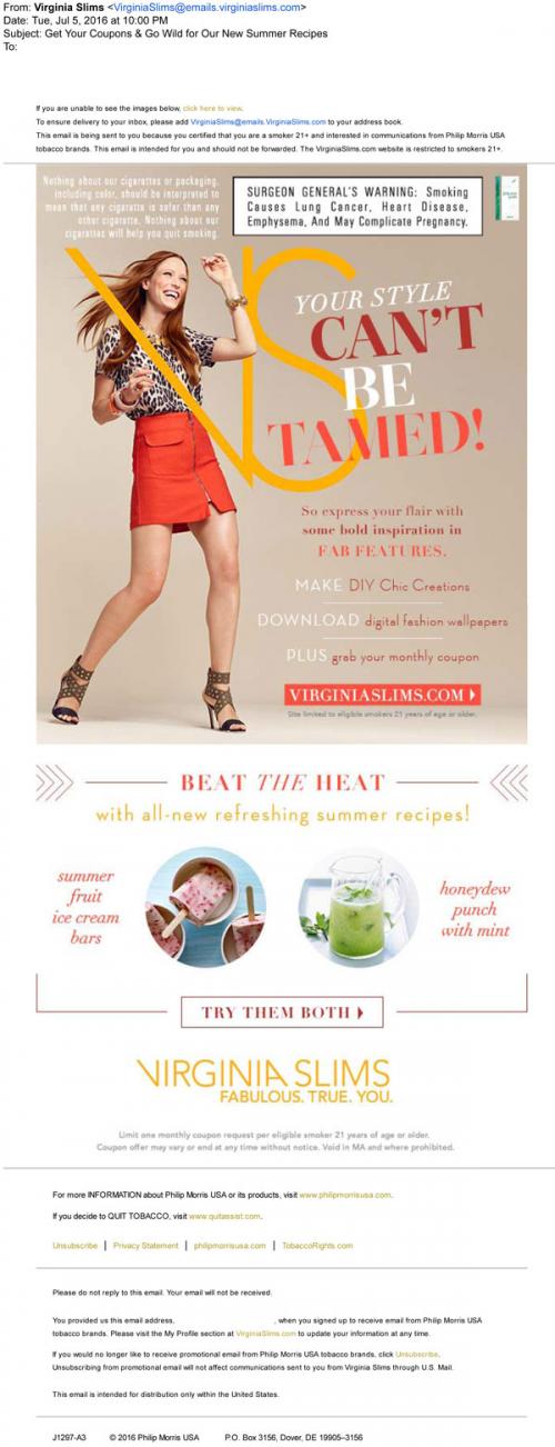 Email from Virginia Slims in July 2016 with links to the brand website to claim monthly coupons and check out "bold inspiration" in craft designs, digital wallpapers, and summer recipes.