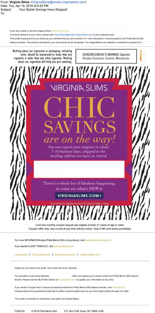 Email from Virginia Slims in April 2016 announcing that the coupons requested from the brand website are in the mail. Invites the recipient back to the site to see what's new.
