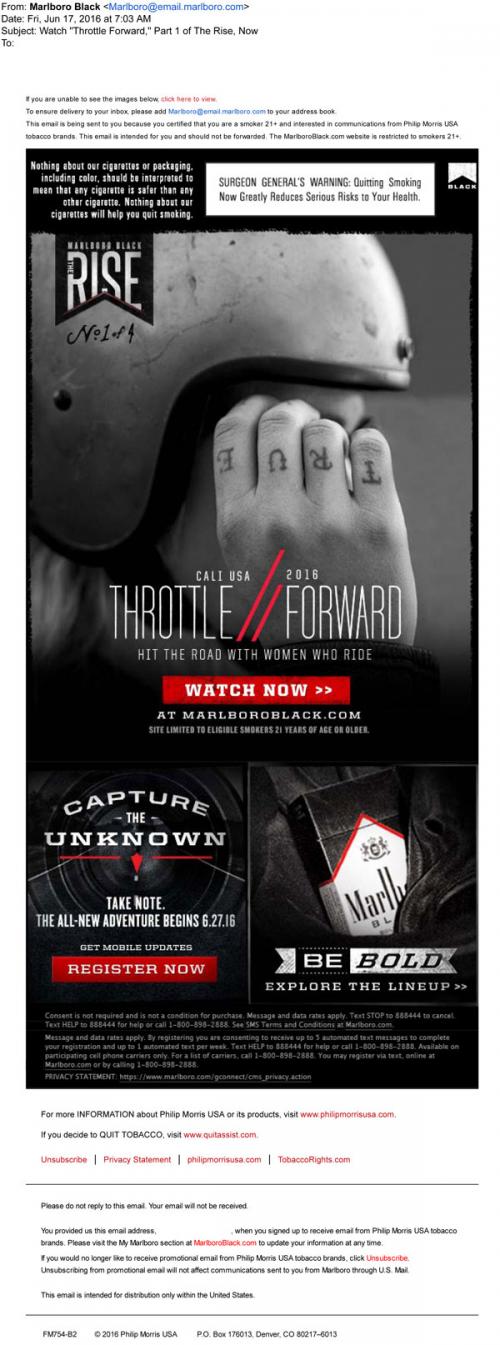 Marlboro Black email from June 2016 promoting The Rise, a video series about women who motorcycle. Also promotes the Capture the Unknown photo contest, and links to a listing of their Bold product lineup.