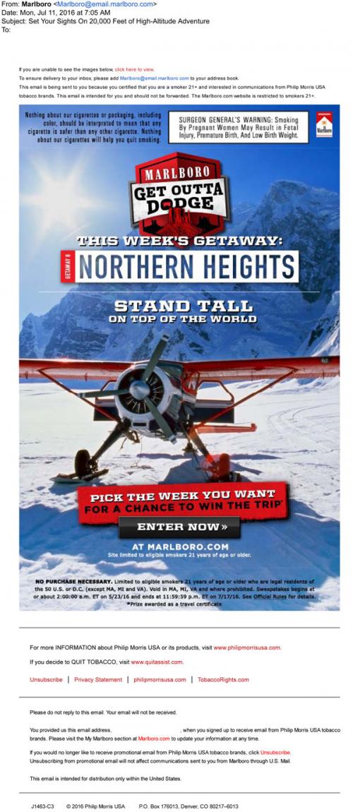 Marlboro email from July 2016 promoting the Get Outta Dodge sweepstakes, with a link to the brand website for a chance to win the recent adventure getaway.