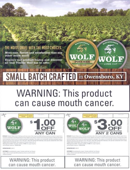 Direct mail from Timber Wolf delivering coupons in July 2016 and promoting their extensive selection of cuts and flavored products.