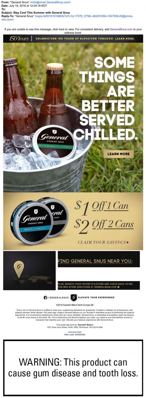 Email from General Snus in July 2016 with a featured article on chilled snus. Also links to the brand website to claim coupons and find a nearby retail location.