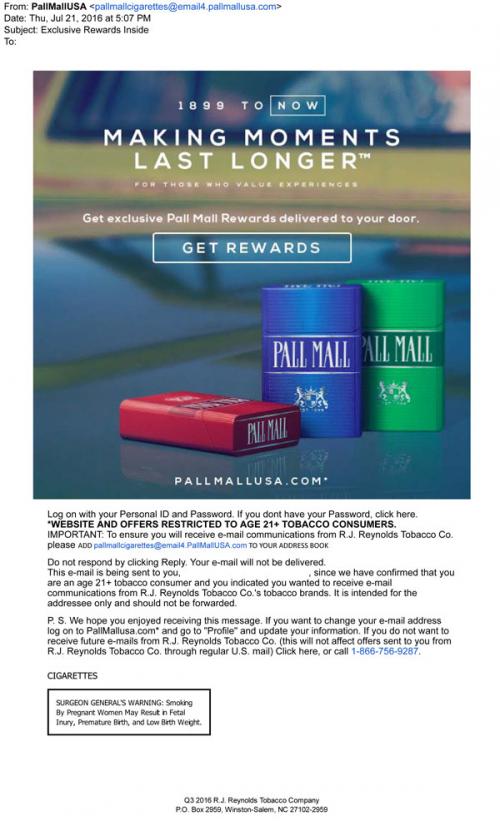 Pall Mall email from July 2016 linking to the brand website to claim coupons.
