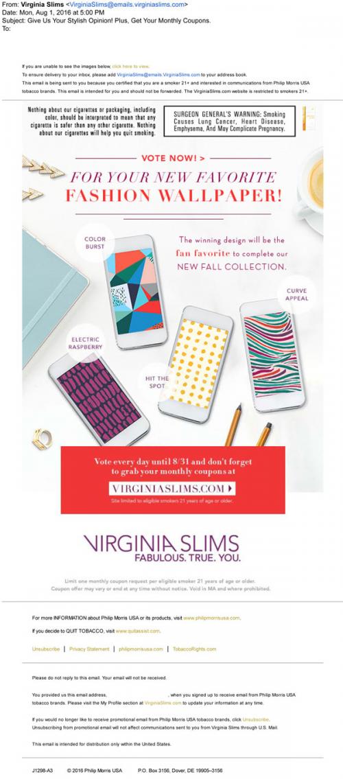 Email from Virginia Slims inviting the recipient to vote on a new fashion wallpaper offered on the brand website during the month of August 2016. Includes a reminder to claim monthly coupons as well.