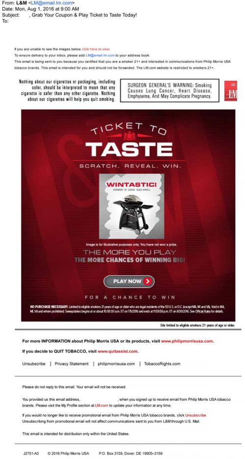 L&M email from August 2016 reminding the recipient to claim a coupon on the brand website and enter the Ticket To Taste sweepstakes.