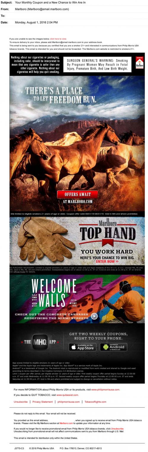 Marlboro email from August 2016 linking to monthly coupon offers on the brand website; also promotes the MHQ app for weekly coupons sent to a mobile phone. Features the Top Hand sweepstakes with a link to enter for a chance to win, and an art piece about street art and graffiti called Welcome to the Walls.
