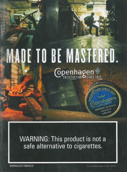Copenhagen ad with images of a man repairing and playing an acoustic guitar. Text: "Made to be mastered."