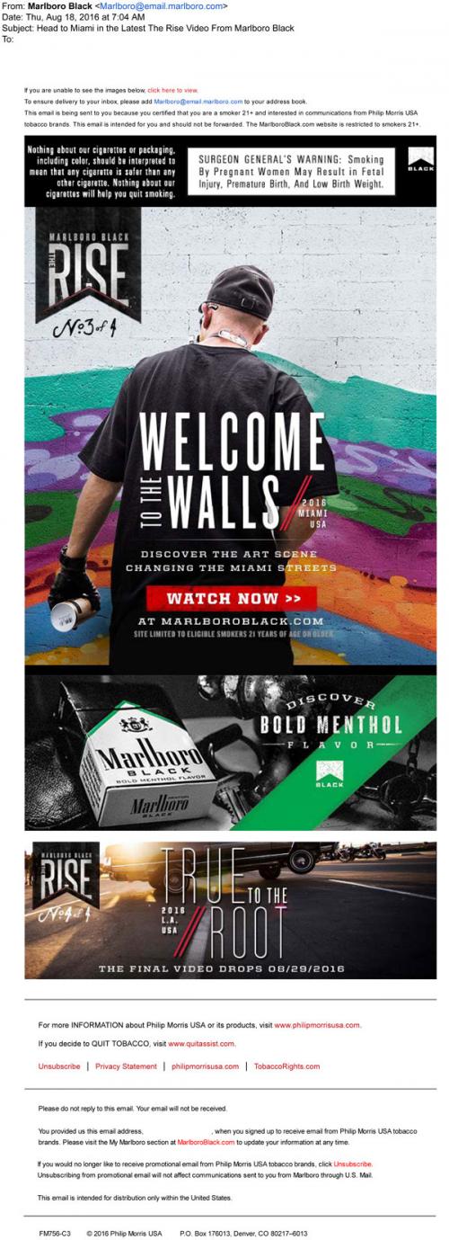 Marlboro Black email from August 2016 promoting the next video in The Rise series and when the final video of the series will drop, as well as featuring their Bold Menthol product. Links to the brand website to check all these things out.