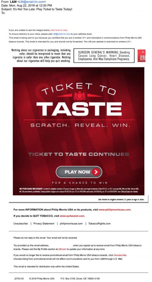 L&M email in August 2016 to promote the Ticket to Taste sweepstakes, with a link to the brand website to enter the contest.