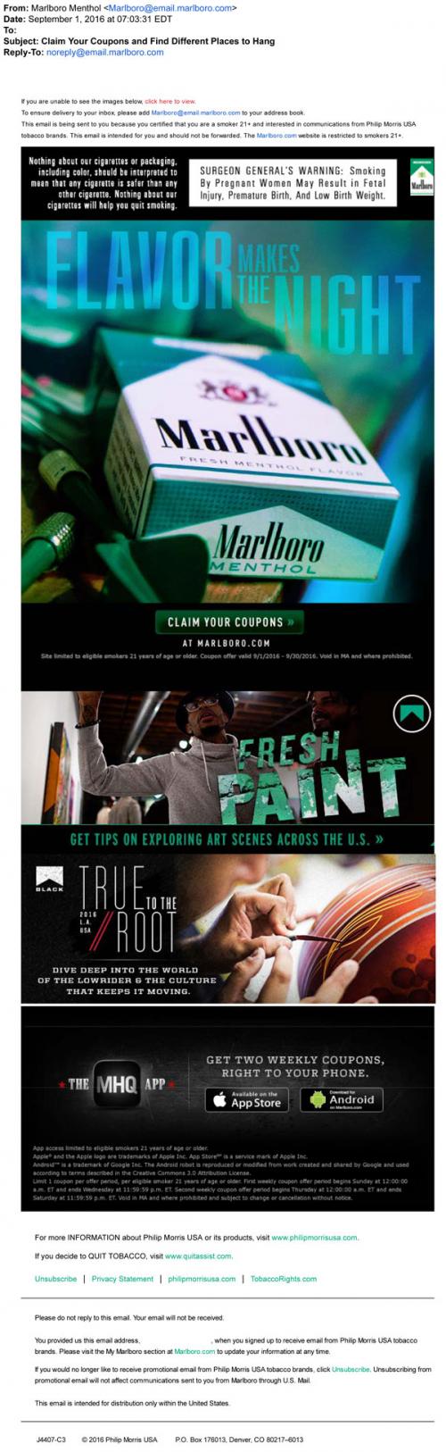 Marlboro Menthol email from September 2016 linking to the brand website to claim