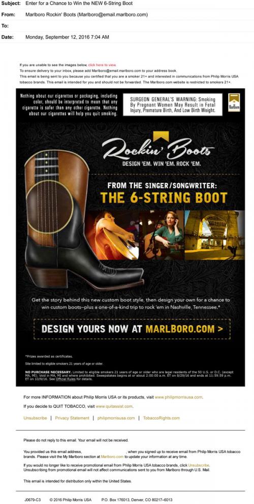 Email from Marlboro in September 2016 to promote the Rockin' Boots sweepstakes. Introduces another boot design and designer on the brand website, with a link to enter.