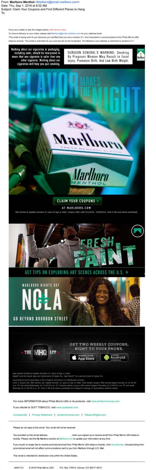 Marlboro Menthol email from September 2016 with a link to claim monthly coupons on the brand website; also mentions the MHQ app to get weekly coupons delivered to a phone. Promotes the Fresh Paint series about art scenes as an alternative to bars, and exploring New Orleans with Marlboro Nights Out.