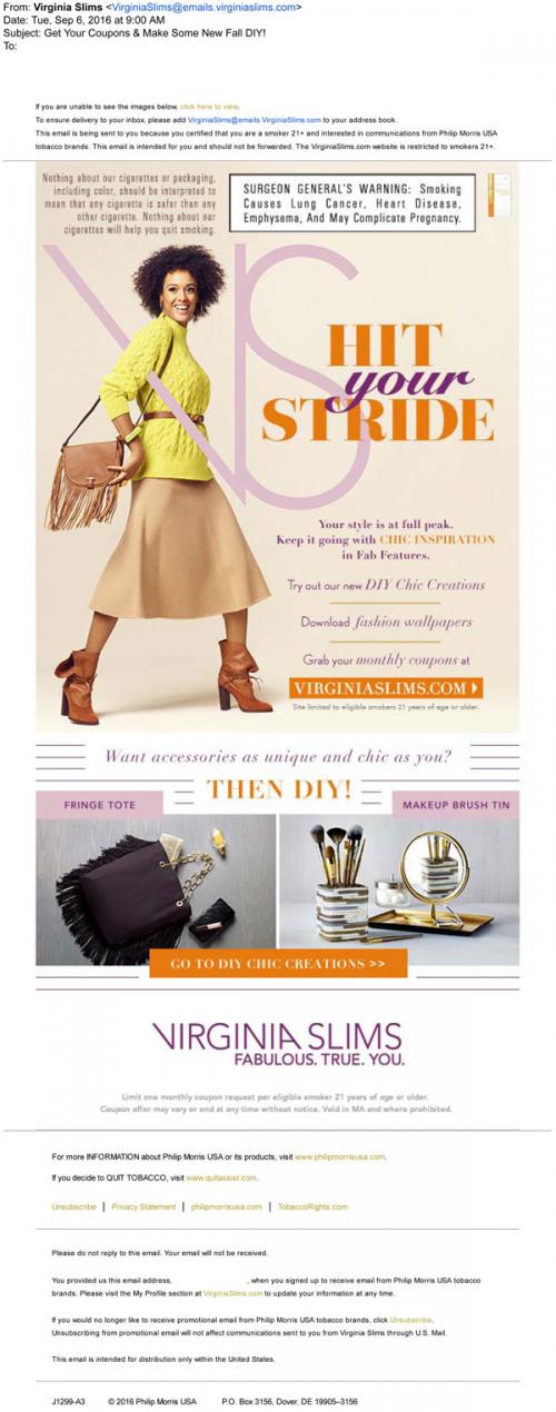 Email from Virginia Slims in September 2016 providing a link to claim monthly coupons on the brand website. Also links to some DIY fashion projects to make, like a tote and makeup accessories.