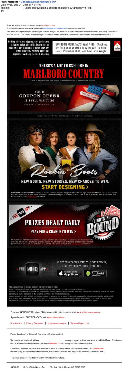 Marlboro email from September 2016 reminding the recipient to claim their monthly coupon on the brand website, and also about downloading the MHQ app to get coupons on a mobile phone. Promotes one of the games on the app, Lightning Round, where players can win prizes, and the Rockin' Boots ongoing sweepstakes.
