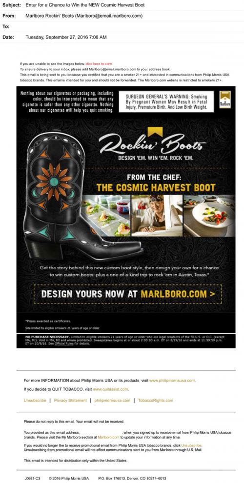 Marlboro email from September 2016 promoting the newest boot design for the Rockin' Boots contest, and inviting the recipient to read more and enter on the brand website.