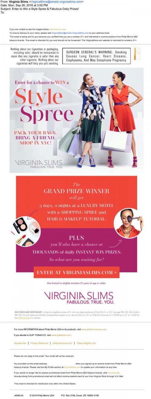 Email from Virginia Slims in September 2016 inviting the recipient to enter for a chance to win a 'style spree' on the brand website. There are also daily instant win prizes available.