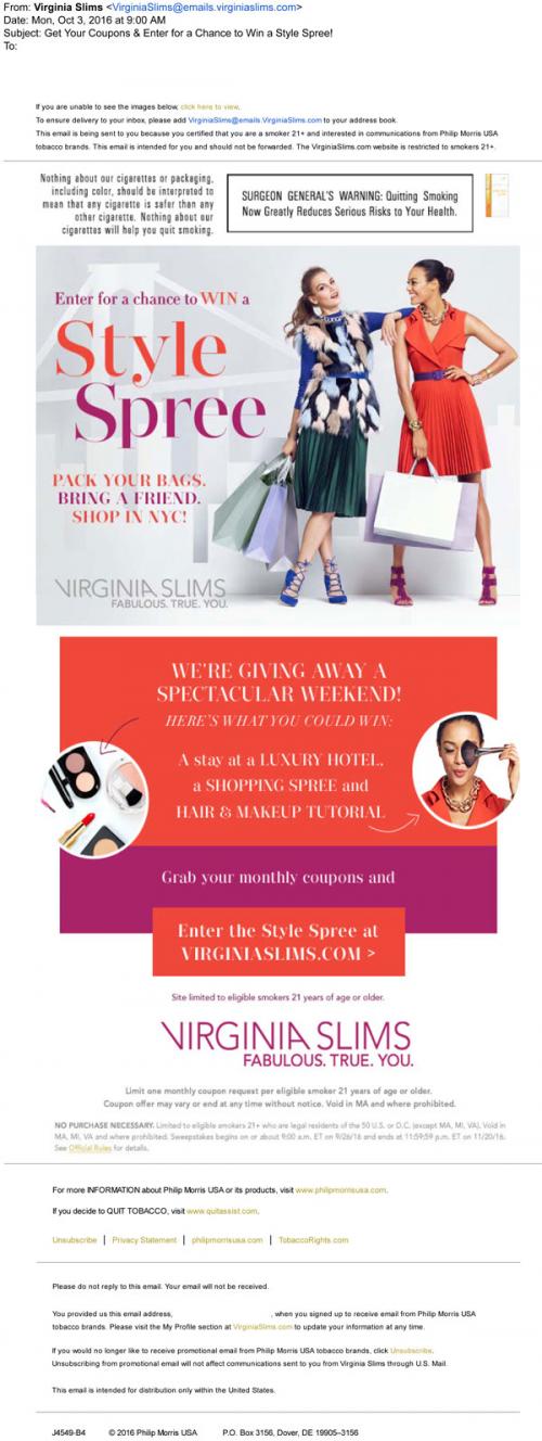 Virginia Slims email from October 2016 promoting the chance to win a style spree, with a link to the brand website to enter. Also reminds the recipient to claim monthly coupons while visiting the website.
