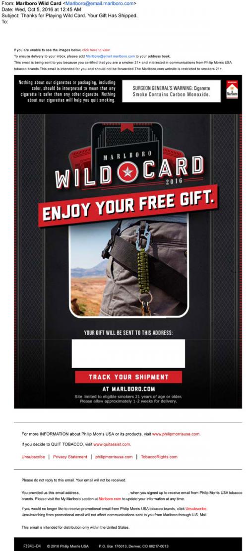 Marlboro email from October 2016 confirming the shipment of a free gift to promote the Wild Card sweepstakes. Participants in the game were eligible to claim a free multi tool key chain on the brand website.