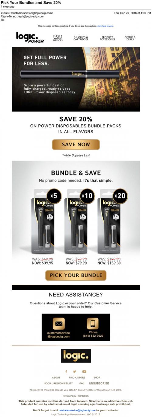 Email from Logic e-cigs in September 2016 promoting a sale on their Power disposables product, with bulk purchases through the brand website. An animated GIF shows the different flavors available.